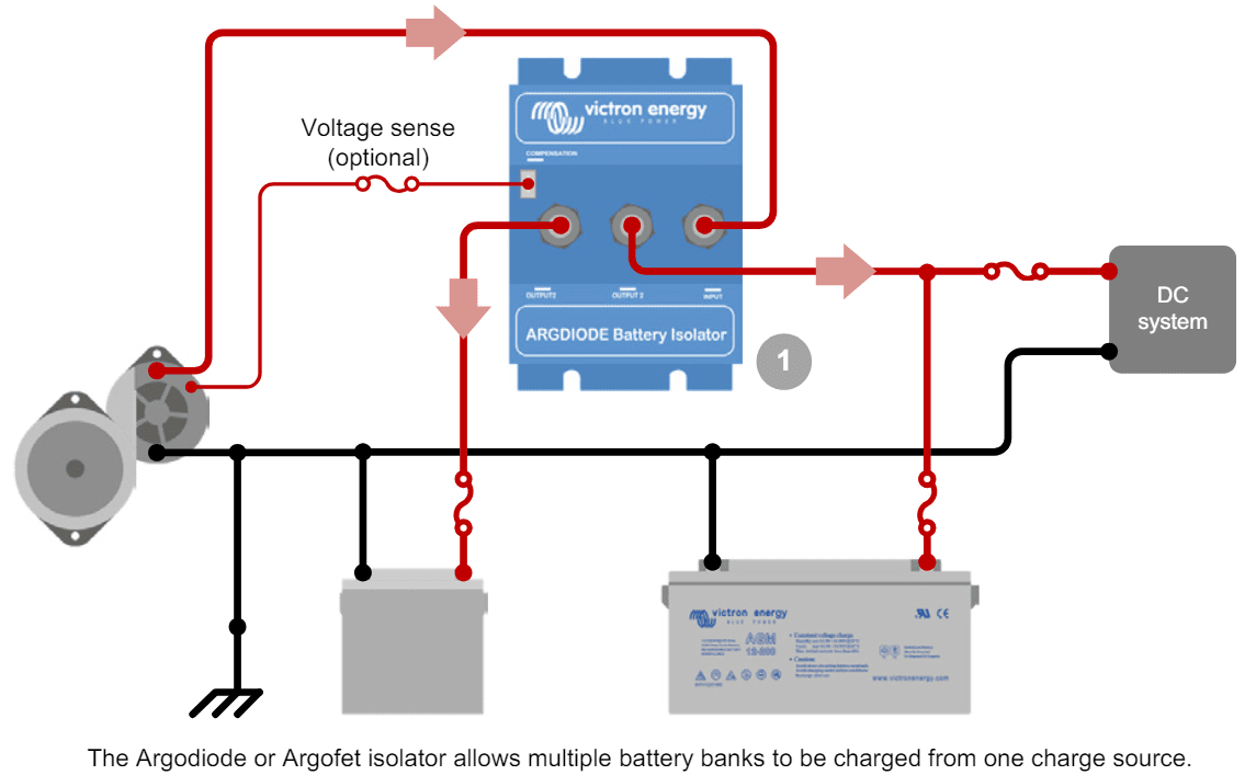 I motsetning til enklere diodeskiller med stort spenningsfall over dioden, bruker ArgoFET FET (Field-Effect Transistor)-dioder som har et spenningsfall på kun 0,02 til 0,1V avhengig av strøm. Vi anbefaler uansett å holde kabelstrekket så kort som praktisk mulig og med kabler i korrekt tverrsnitt.